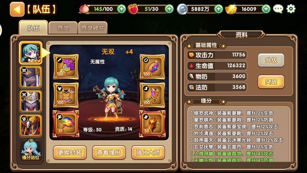 在《封灵师》的游戏世界内,强化、精炼装备和法宝可以提升队伍的属性,除此之外,还可以上阵和队伍灵将有缘分的小伙伴来激活缘分,激活缘分之后战力会有明显的提升哦!当然除了灵将和灵将之间的缘分之外,装备也是可以激活缘分的,穿戴和主角或者队伍灵将有缘分的装备,也可以提升战力哦!