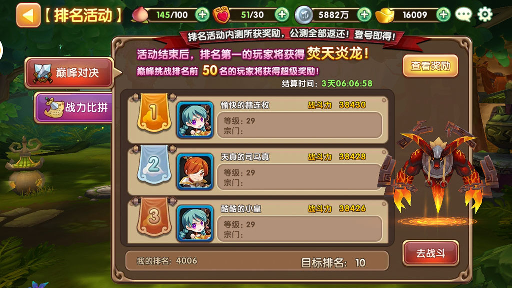 10级开放竞技场,在主界面右上角中有声望商店,玩家可以用声望来购买各种稀有道具。另外排行榜前1000的玩家每天22:00点还能领取竞技场排名奖励(以邮件形式)